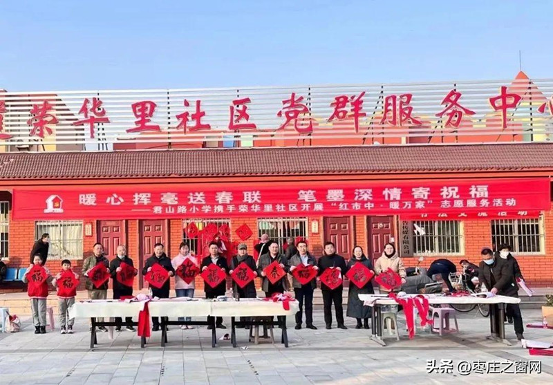 1月11日下午,接到區(qū)融媒體中心的電話,《棗莊之窗》小編驅(qū)車來到榮華里社區(qū),感受這里不一樣的年味氣氛。來到社區(qū)大院,看到書法愛好者、社區(qū)紅馬甲、學生們,還有周邊的社區(qū)居民早早來到大院忙乎了起來,你搬案桌,我裁紙,他研墨水,準備著一場書寫春聯(lián)的筆墨盛會。